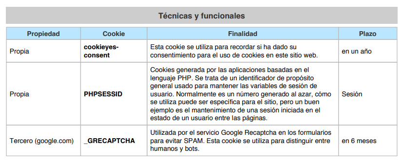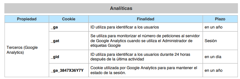 COOKIES UTILIZADAS EN ESTE SITIO WEB